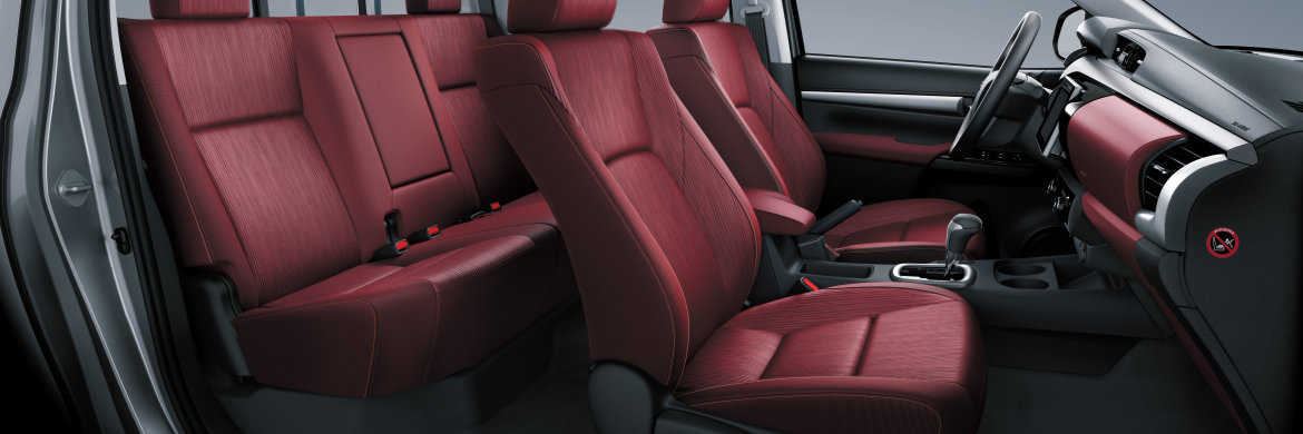 The spacious Hilux cabin offers a number of functions and a minimum of physical strain. All the essential equipment and information is easy to access on the ergonomically excellent dashboard. Large pockets and a selection of clever storage compartments ensure you have enough room to stow your personal belongings. The four-door variant boasts a split folding rear seat so you can adjust the set up depending on your needs.